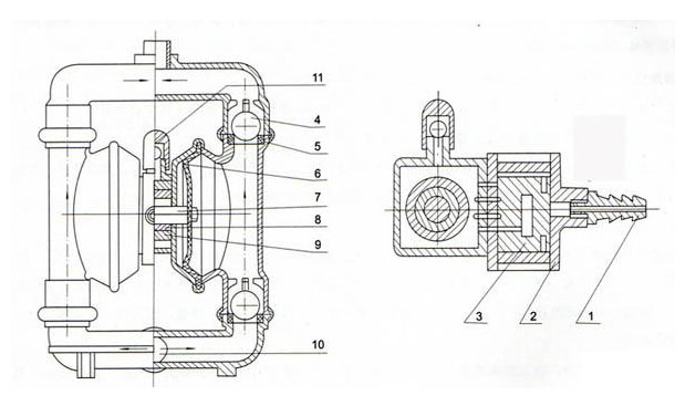 1 進氣口 2 配氣閥體 3 配氣(qì)閥 4 圓球 5 球座(zuò) 6 隔(gé)膜 7 連杆 8 連杆銅套 9 中間支架 10 泵進口 11 排(pái)氣口