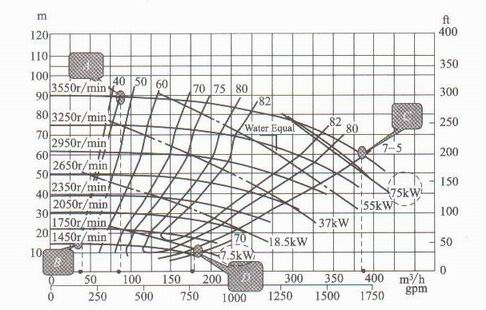 在變轉速下泵(bèng)的小流量限製是有眾多不同速度下的泵的性能曲線(xiàn)上左側的小流量限製點所形成的一條小流量限製線(由A、B 兩點連成的線),如圖(tú)1所(suǒ)示(shì)。在變轉速下泵的大流(liú)量限製是由眾多不同轉速下的泵(bèng)性能(néng)曲線上右端的(de)限製點所形成的一條限製線(如由C 、D兩點連成的線)。