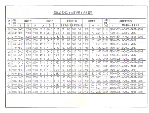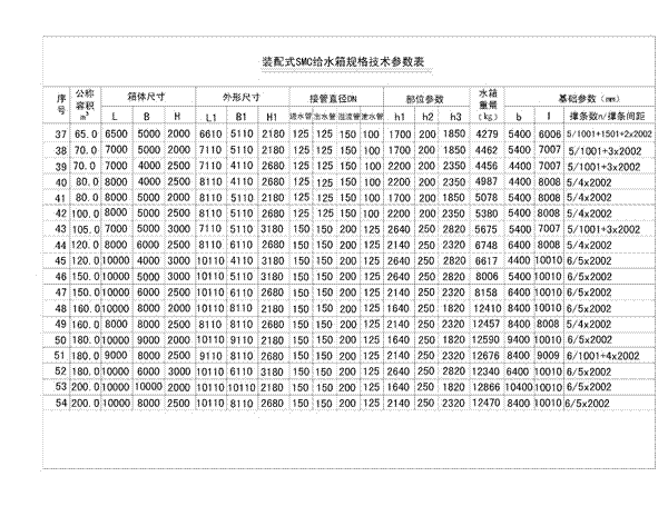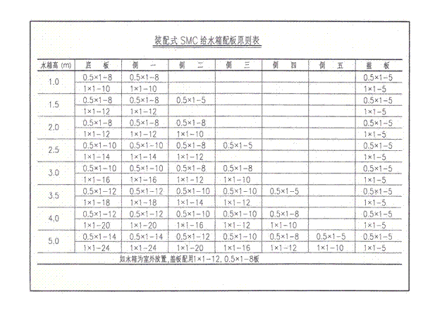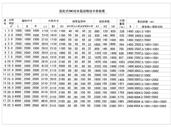 注:1、裝配式SMC給水箱單板型號(hào)為MT-SB-XxY-Z其中(zhōng)(X為單板長度m,Y為單板狂度m,Z為單板厚度mm),表中各種板型省略“MT-SB-”.