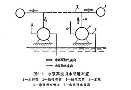 如果(guǒ)泵站中有兩台(tái)以上(shàng)的水泵,則可將水環式真空泵進氣管與抽氣母管相(xiàng)通,每台泵(bèng)的泵殼頂部通過(guò)抽氣支管與抽(chōu)氣母管相連(lián)。在每個支管上都(dōu)安裝一(yī)個閥門,以便可以單獨對每一台泵抽(chōu)氣。有時,為了備用起(qǐ)見,可(kě)以設置兩台水環式(shì)真空泵,每一台的進氣管上都安上閥門。當一台發生故障時,可以關閉該泵(bèng)上的進氣閥門,利用另外(wài)一台抽氣,不致耽誤水泵的起動。正常情況下(xià)兩台(tái)水環式真空泵可(kě)對水泵同時抽氣,以加快引水速度。整個管路布置如圖5-2所示。