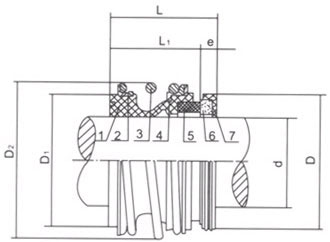 1.橡(xiàng)膠波紋管 2.後緊圈 3.彈簧 4.前緊圈動環 6.靜環(huán) 7.靜(jìng)環密封墊