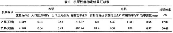 有效(xiào)功率是水泵傳(chuán)給水的淨功率。也就是水(shuǐ)泵在單位時間內,給多(duō)少重量的水提升了多少(shǎo)高度。水泵效率是有效功率與軸功率之比。效率愈高(gāo)。表示水泵本身損失的功率愈少。從表2數據中可以(yǐ)看出,2泵在開工頻冷水泵時出口壓力0.53MPa、水泵有(yǒu)效功率616.37kW。電機有用功率1311kW、功率因數cos<P0.96、機泵(bèng)效率47.02%。在變頻狀(zhuàng)態下冷水(shuǐ)泵出口(kǒu)壓力(lì)調至供水壓力(lì)下限0.43MPa、水泵有效功率486.44kW、電機(jī)有用功率858kW、功率因數cosq)0.97、機泵效率56.69%。數據說明變頻狀態下變頻泵(bèng)在出El壓力降低時。電機的有用(yòng)功率有所下降,水泵的有效功率也隨之下降。但電機電流降低了約40%,同時功率因數和機泵(bèng)效率卻有所上升,表明在滿足供水壓力、流量的前(qián)提下。使用變頻泵和工(gōng)頻泵並(bìng)聯運行,可比兩台工(gōng)頻泵並聯運行(háng)節能。見表3。