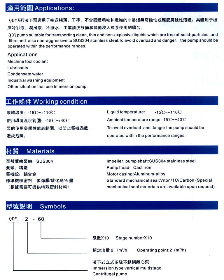 QDY不鏽鋼多級液下泵主要零部件如(rú)葉輪、導流器、泵軸用不鏽鋼製造,不(bú)鏽鋼多級液(yè)下泵所有過流部件、觸液部(bù)件均為不鏽鋼製造,具有良好的(de)耐(nài)腐蝕性能,采用硬質合金(jīn)軸承及機械密封,剛(gāng)性聯軸器傳動,具有體積小、重量輕、抗腐蝕、振動小、噪音低(dī)、占地麵積小、使用壽命長,外(wài)形美觀等特點,特別是高效、節能等優點(diǎn)。