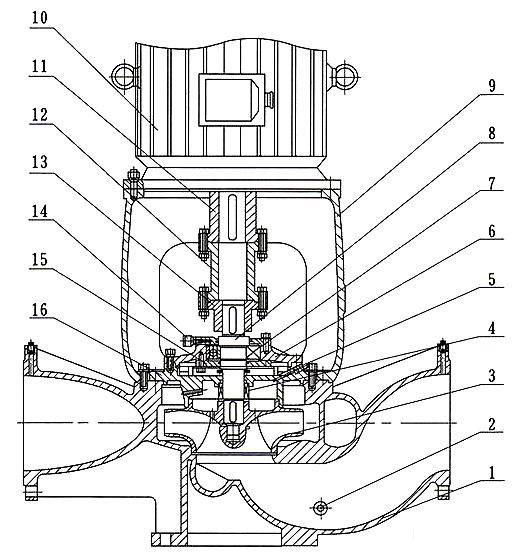 1 泵體 2 放水塞 3 葉輪 4 機械密封 5 放氣(qì)閥 6 軸承體 7 軸承 8 泵軸 9 支架 10 電(diàn)機 11 電機聯軸器 12 中間聯軸器 13 泵聯軸器 14 油杯 15 軸承壓蓋 16 泵蓋