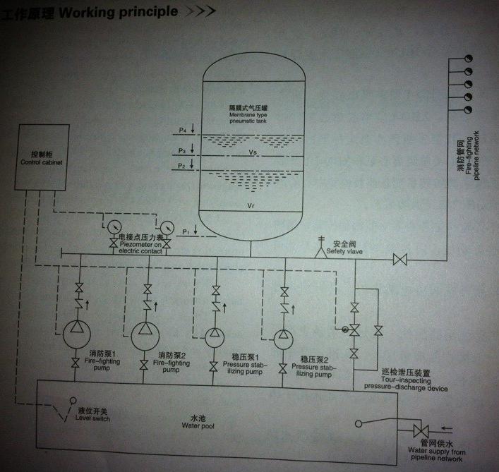 穩壓泵工作時將水送至給水管網(wǎng),多(duō)餘的水進入(rù)氣壓罐後,水室(shì)擴大,氣室(shì)縮小,壓力隨之升高,當壓力升至穩壓上限(xiàn)P4時,水泵停轉,此時氣壓罐內被壓縮氣體的壓力將貯存的水送(sòng)入管網,氣壓罐的水室縮小,氣室擴大,壓力隨(suí)之下降,當壓力降至(zhì)穩壓下限P3時,穩壓泵又重新啟動.如此周而複始,穩壓(yā)設備不斷運行.當發生火(huǒ)情時,消火栓或噴頭開啟,穩壓泵不能滿(mǎn)足保壓要求,壓力繼續下降,當壓力(lì)降至消防工作壓力P2時(或其他消防信號反饋)消防主泵(bèng)自(zì)動啟動.