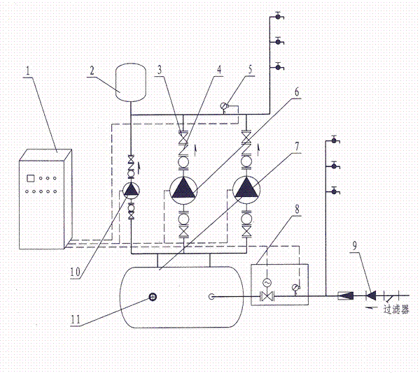 (3)在用水高峰期間(jiān),用戶管(guǎn)網壓力下降,當降到低於設定壓力時,遠傳壓力表發出信號給變頻數控櫃,使變頻器頻率升高,水泵機組轉速將加快(kuài),出水量(liàng)和壓力都隨之上(shàng)升,直至用戶實際壓力值等於設定壓力(lì)值。在用水(shuǐ)低(dī)穀期間,用戶管網壓力上(shàng)升,當高(gāo)於設定(dìng)壓力時,遠傳壓力表發出信號給變頻數控櫃,使變頻器頻率降(jiàng)低,水泵機(jī)組轉速降(jiàng)低,使用戶管網(wǎng)實際(jì)壓(yā)力值等於設(shè)定壓力(lì)值,若水泵機組(zǔ)已無實際流量,水泵處於(yú)空轉狀態時,則水(shuǐ)泵(bèng)機組自(zì)動停止(zhǐ)工作。自來水直接通過旁通管到到達用(yòng)戶。