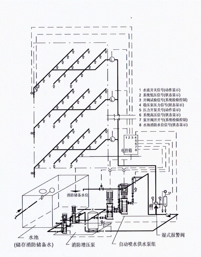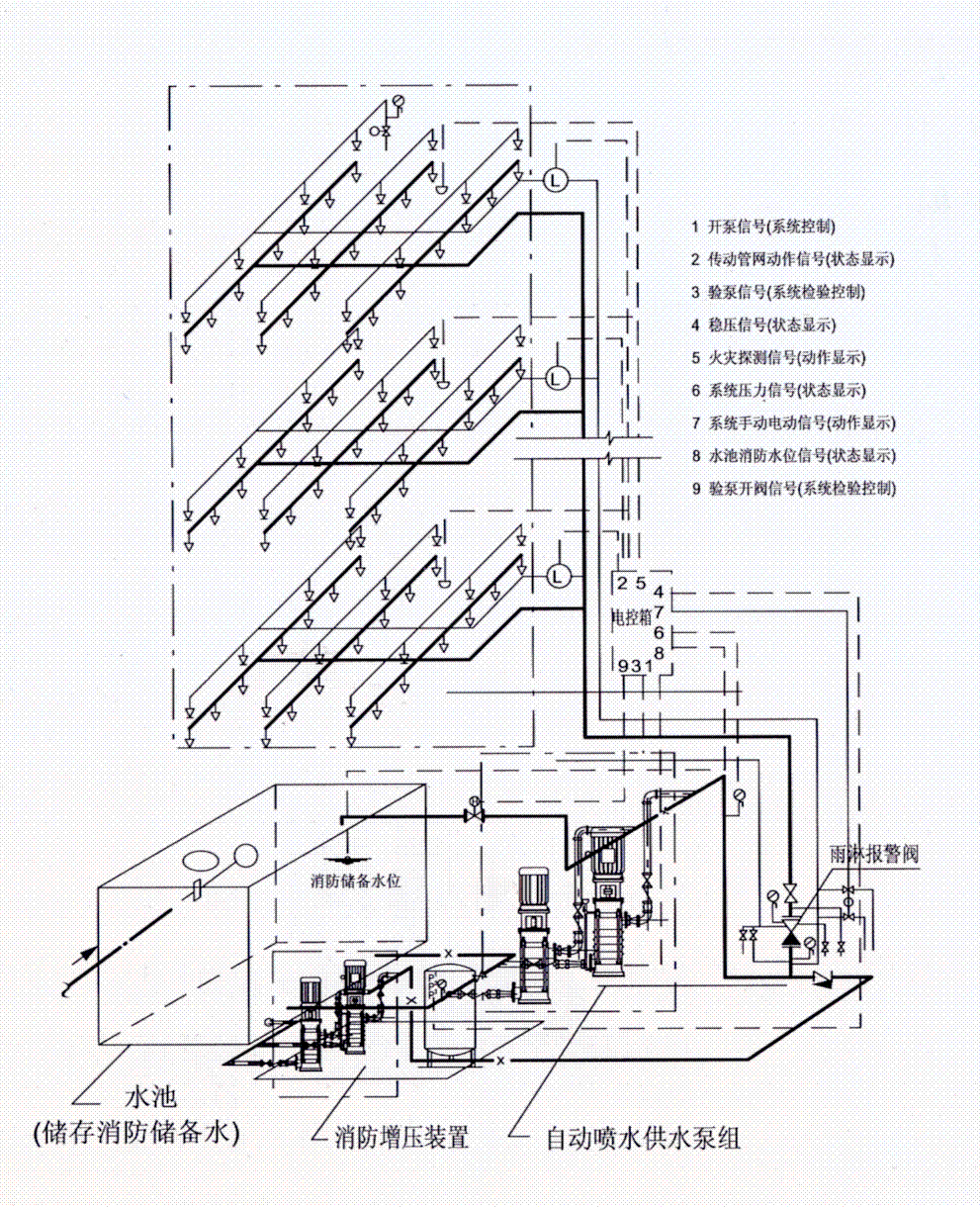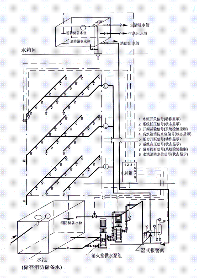 自(zì)動噴(pēn)水濕式係統(高水箱穩(wěn)壓)原理(lǐ)圖