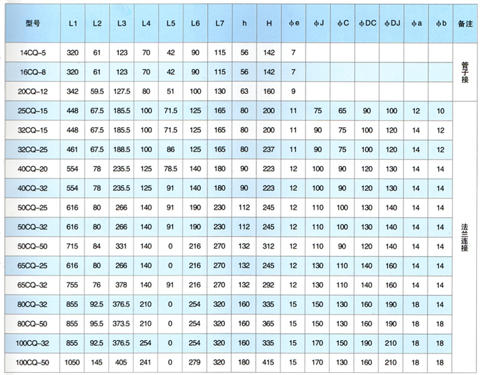 CQ型磁力驅動泵安(ān)裝尺(chǐ)寸表: