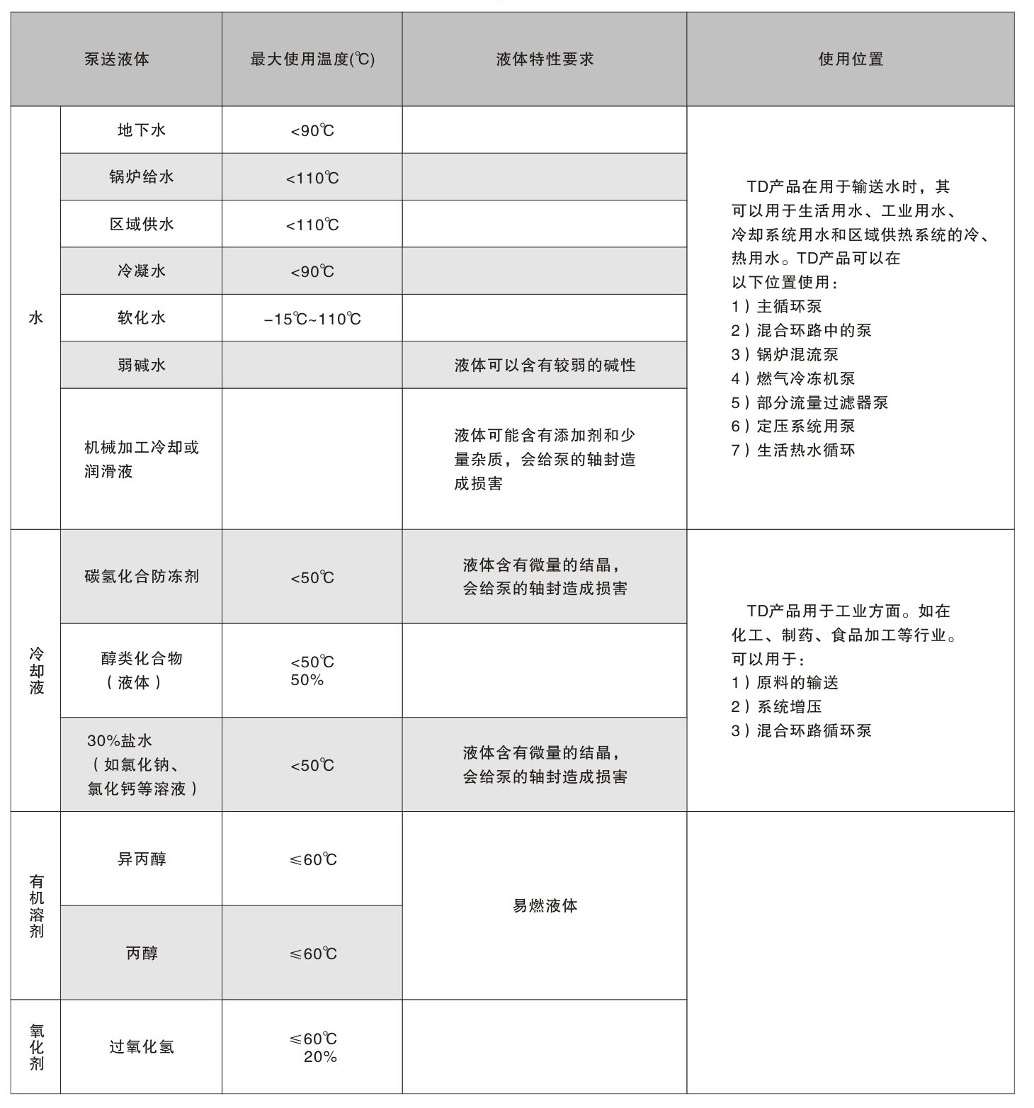適宜在清(qīng)潔、稀薄、非侵(qīn)蝕、非易(yì)爆易(yì)燃,且不含有任何可能對泵(bèng)造成機械或化學損害的固體顆粒和(hé)纖維的液體中使用。具體對液體要求及應用如下;而在液體粘(zhān)稠或密度較大情(qíng)況下使用時會造(zào)成泵特性曲線的下降和能耗的增加。