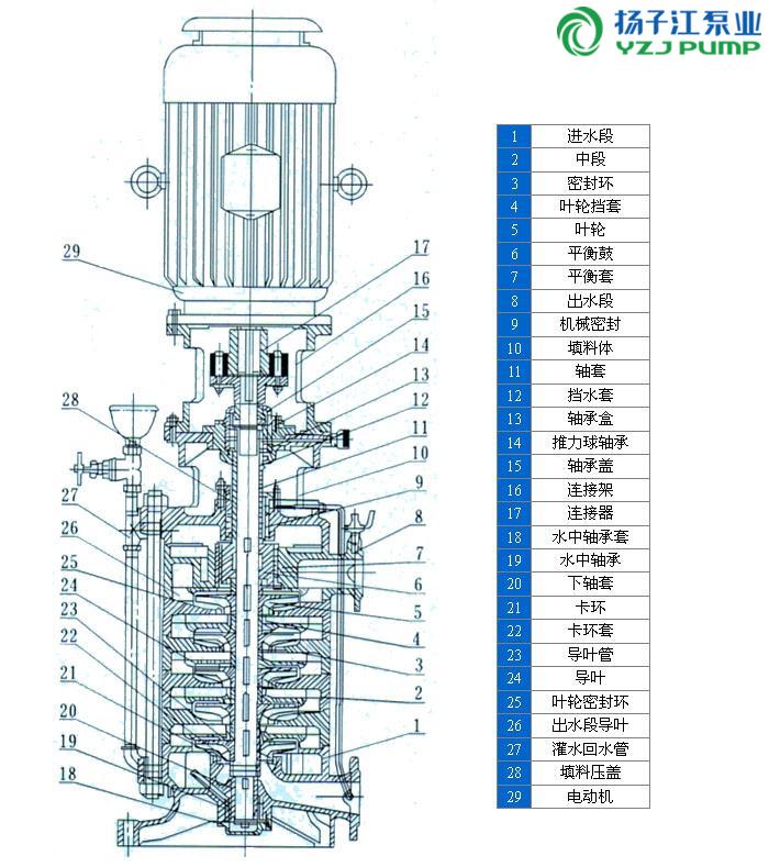 DL型泵由電機和泵(bèng)兩部分組成,電機為丫型三相導步電機,泵和電機采用聯軸器連接.整體為(wéi)剛性連(lián)接,使(shǐ)用吋(duò)無需校正泵由定子部分利轉子部分組成泵定(dìng)子部分由進水段(duàn).中段.導葉(yè).出水段、填料函體等零件組成為防止定子磨損,定子上(shàng)裝有(yǒu)密封環.平衡等(děng),磨(mó)損後可用備件更換轉子部分由軸.中輪(lún),平(píng)衡鼓等組成轉子下端為水潤滑軸承(chéng).上部為角(jiǎo)接觸球軸承.泵的軸向力絕大部分由平衡鼓來承擔,其餘小(xiǎo)部分殘餘軸向力由(yóu)角接觸球軸承來承受逬水段、中段和出水跺的結台麵用紙(zhǐ)墊通過拉緊達到密封.軸封采用填料(liào)或機械密封.用戶可根據需要選擇。