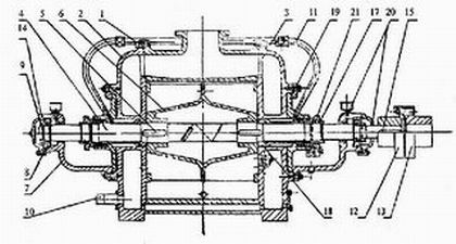 1.泵體 2.後蓋 3.前(qián)蓋 4.泵軸 5.平鍵 6.葉輪 7.軸承瓦架 8.滾珠軸承 9.園螺(luó)母(mǔ) 10.進水管 11.水封管 12.泵聯軸器(qì) 13.電機聯軸器 14.軸承蓋 15.鍵 17.軸套螺母 18.軸套 19.填料涵 20.毛氈圈 21填料函壓蓋 |
