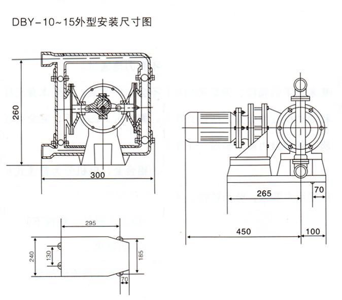 新研(yán)製開發的DBY-80-100擺線式(立式)不鏽鋼四氟電(diàn)動(dòng)隔膜泵,采用XLD係列擺線針輪減速機傳動動力,電動(dòng)隔膜泵是一種新(xīn)型的泵(bèng)類,近年來,由於在隔膜材質上(shàng)取得了突破性的進展,國際上越來越多的工業化國(guó)家采用此種型式的泵,取代部份離心泵、螺杆泵,來應用於石化、陶瓷、冶金等行業,產品設計均參(cān)考美國ABEL公(gōng)司樣機,該泵適用於低壓,即(jí)出口壓力≤3kgf/cm2的場合。