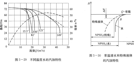 特(tè)殊液體(tǐ)是指和常溫清水不同的液(yè)體,如高溫水和油等。實驗表明,不同溫度的水的汽蝕對泵性能(néng)影響的(de)趨勢如圖5-29所示。