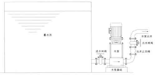 蓄水池自灌引水方(fāng)式布置的水(shuǐ)泵運行原理如下圖,一般水泵與蓄水池均布置於地麵(miàn)以上,蓄水池內水位必須高於水泵(bèng)出口端排氣(qì)孔,以保證水泵起動之前蓄水池內的水能自動灌入水泵泵腔,並將泵腔內的空氣排盡(jìn)。這種安裝方式水泵的(de)進水口需安裝一(yī)隻閥門,當水泵(bèng)故障需要拆下(xià)維修或更換時,可將閥門關閉,以防止蓄水池內水外泄。