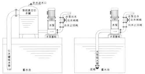 蓄水池吸上引水(shuǐ)方式布置的水泵(bèng)運行(háng)原(yuán)理如下右圖,蓄水池一(yī)般建於(yú)地麵以下,而水泵位於地麵上,蓄水池水位低於水泵(bèng)進水口,因此,蓄水池內的水不能自動灌入水泵泵腔(qiāng),為了使水泵正(zhèng)常工作,在水泵起動前必須人工將水灌滿水泵泵(bèng)腔和水泵吸(xī)水管,將泵腔內空氣(qì)排盡。所以蓄水池內水泵的吸(xī)水管底端需安裝底閥,但由於市場上一般底閥密封性不是很(hěn)好,加(jiā)之水中的顆粒容易進入底閥使底閥關閉不嚴(yán),所以(yǐ)目前采用安裝底(dǐ)閥方式越來越少,大多改為加裝引水罐形式(下左(zuǒ)圖),由於加裝了引水罐,不需(xū)人工灌(guàn)引水(shuǐ),且無底閥(fá),使水泵吸水口由負壓(yā)吸水變為正壓吸水,所以水泵運行可靠性要高(gāo)得多。