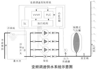 係統正常運行時,用(yòng)戶用水管網上(shàng)的壓力傳感器對用戶的用水水壓進行數據采樣,並將壓力信號(hào)轉換為電信(xìn)號,傳(chuán)輸至PI D調節器,然後與用戶設定的壓力值進行比較和運算,並將比較和運算的結(jié)果轉(zhuǎn)換為頻率調節信號和水泵啟動台數信號分別送至變頻器和可編程控製器(P LC);變頻器據(jù)以調節水泵電(diàn)機的電源頻率,進而調整水泵的轉速;可編程控製器根據PI D調節器傳輸過來的水(shuǐ)泵啟動台數信號控製水泵的(de)運轉。通過對水(shuǐ)泵的啟動和停(tíng)止(zhǐ)台數(shù)及其中變(biàn)頻泵轉速的調節,將用戶管網中的水壓恒穩於用戶預(yù)先設定的壓力值,使供水泵組“提(tí)升”的水量與用戶管網不斷變化的用水量保持一致,達到“變量恒壓供水”的目的。