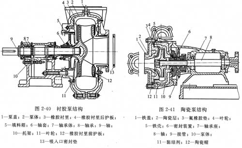 襯膠泵結構如圖2-40所示。其大流量可達1500m3/h,大揚程可(kě)達50 m,高使用溫度80℃,高使用壓力1.6 MPa。襯膠(jiāo)泵能用於輸送(sòng)硫酸、鹽酸、磷酸、氫氟酸、氫氧化鉀(jiǎ)等強腐蝕性介質,並適合(hé)輸送(sòng)含有顆粒的腐蝕性液體,但不能用於輸送(sòng)濃硫酸、濃硝酸等強氧化性酸。