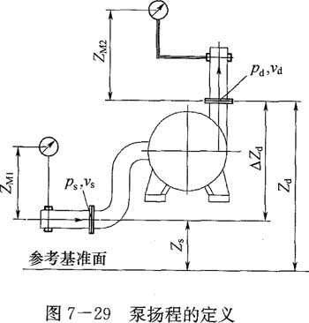 化工泵揚程是單(dān)位重量的液體在泵(bèng)出口(kǒu)與(yǔ)泵進口的(de)能量差(chà),泵的出口和進口通常(cháng)為泵的出口和(hé)進口法蘭。按揚程定義,圖7-29所示