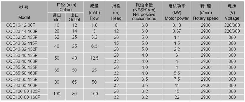 CQB-F型氟塑料磁力泵的過流部件均采(cǎi)用“聚偏二氟塑料合金(PVF2)和超高(gāo)分子量聚乙烯(UHMWPE)”製造。在常溫(wēn)下,PVF2對鹵素、鹵代烴、強氧化劑、沸酸、堿等多(duō)種有機溶劑都有(yǒu)良好(hǎo)耐蝕性;UHMWPE對非氧化性酸(稀硫酸、硝酸及濃度較大(dà)的(de)鹽酸、磷酸、氫氟酸、甲酸(suān)、乙酸)、氨和胺及各種堿(jiǎn)、鹽溶液都有良好的耐蝕(shí)性,兩種材料都不耐強氧化性酸的腐蝕。氟合金泵的外殼為金屬材料(liào),有足夠的強度承受管道以及外界的機(jī)械衝擊。傳動功(gōng)率3kW以下的采用全氟結構。