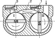 雙級旋片式真空泵工作原理圖 1-高級排氣閥;2-通(tōng)道;3-低(dī)級排氣閥(fá) |