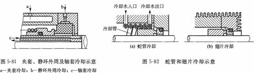 ①間接冷卻 間接冷卻有密封腔夾(jiá)套冷卻、靜環外周冷卻、軸套冷卻和換熱器冷卻等(děng)方式。換熱器(qì)冷卻(què)中有離心泵密(mì)封腔內置(zhì)式換(huàn)熱器和外置式冷卻器、蛇(盤)管冷卻器、套管冷卻(què)器、翅片冷卻器以及(jí)缺水地帶用(yòng)的(de)蒸(zhēng)發冷卻(què)器。常用的傳熱介質是水、蒸汽和空氣。圖5-81和圖5-82為幾種間接冷卻的示意圖。