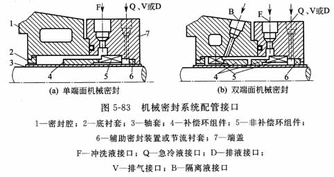 為了防止(zhǐ)注入流體的泄漏,需要采用輔助密封,如襯套密封、油封或填料密封。急冷或(huò)阻(zǔ)封流體一般用水、蒸汽或氮氣。液體的壓力通常為0.02~0.05 MPa,進出口的溫差控製在3~5℃為宜。圖5-83為典型機械密封係統配管接口,其中包含急冷(阻封)接口及密封急冷液的輔助密封。