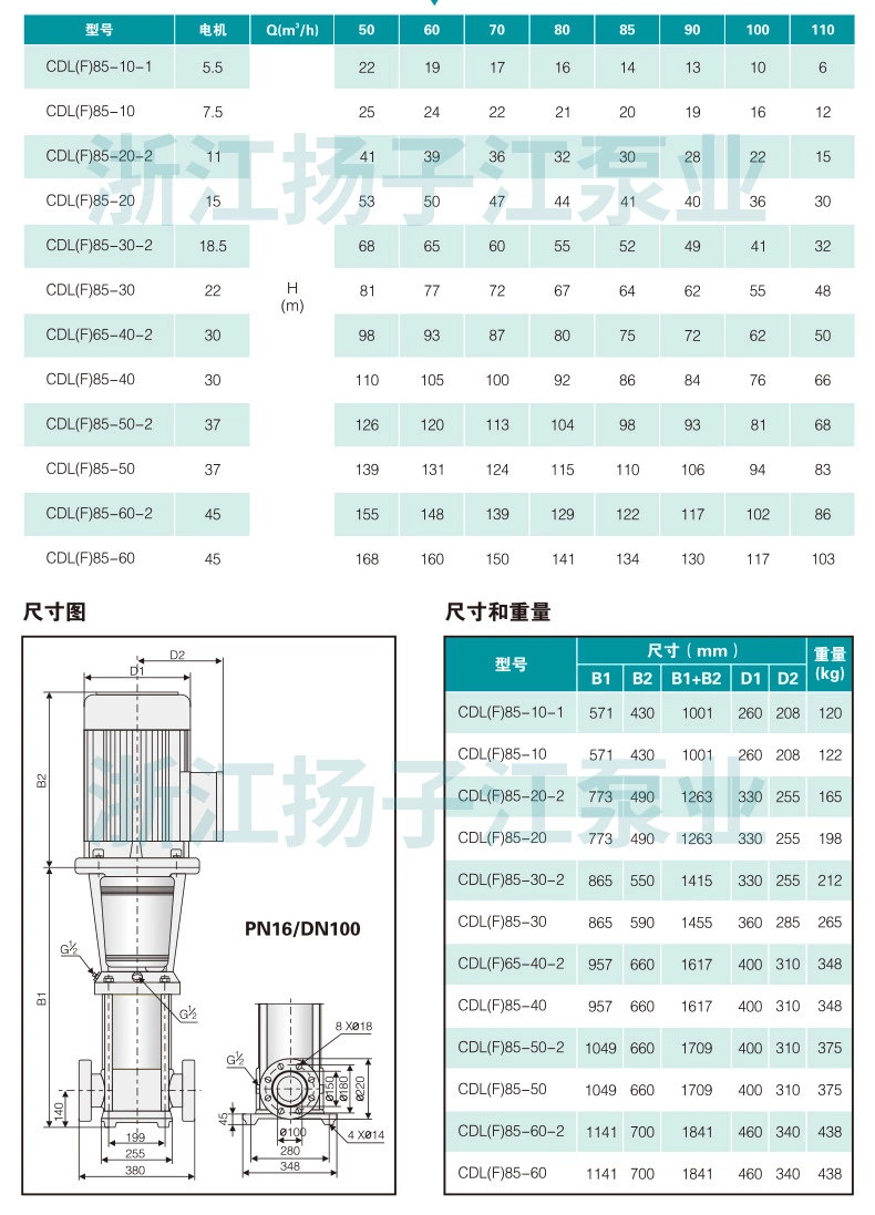 當額定流值為16(m3/h)時,泵進出口徑為,法蘭型:PN25/DN50;管螺紋型(xíng):R1=2。流量範圍:8~22(m3/h);揚程範圍(wéi):16~222(m);功率範圍:2.2~15(kw)。