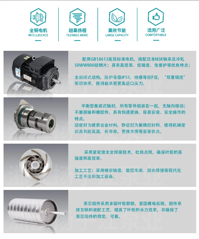 QDL輕型多級離心泵主要零部件如葉輪、導流器、泵軸、外圓筒用不鏽鋼製造,QDL(N)係列所有過流部(bù)件均(jun1)為不(bú)鏽鋼製造(zào),具有良好的耐腐蝕性(xìng)能,采用硬質合金軸承及機械密封,剛性聯軸器傳動,具有體積(jī)小、重量輕、抗腐蝕、振動小、噪音(yīn)低、占地麵積小、使用壽命長,外形(xíng)美觀等(děng)特點,特別是高效、節能等優點(diǎn)。