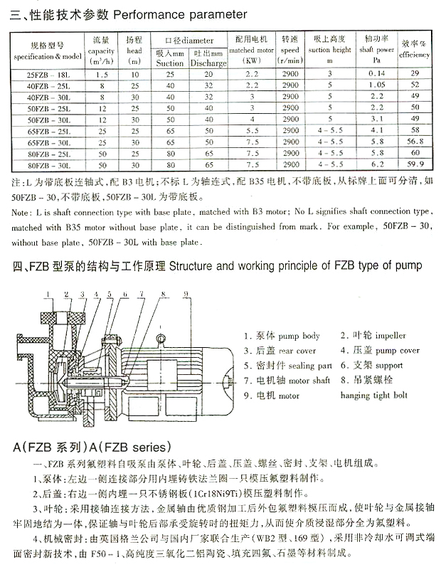 1、我公司生產的(de)FZB係列氟塑料自吸泵,適合於在-20度到100度溫度(dù)的條件下長期輸送濃度的任意介質:酸、氧化劑及腐(fǔ)蝕性介質(禁輸(shū)快速硬質結晶體介質),過流部分全部采用氟塑料增強聚丙烯合成(聚四氟乙(yǐ)烯和聚全氟(fú)乙丙烯等多種氟(fú)材料經過合理配方)模壓加工而成,它集多種(zhǒng)氟塑料之優點,具有特強的耐(nài)腐蝕性,機械強度高,不老化,無毒素分解等優點。如輸送(sòng)結晶、顆粒及(jí)懸浮物需告知我公司,以便安裝相應的密封(fēng)。
