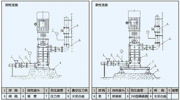 3.泵(bèng)與底座安裝有兩種(zhǒng)方式,一種是直接裝在水泥基礎上的剛性連接,另一種是采用JGD型減振器安裝(zhuāng)的柔性連接,具體方法見安裝示意圖所示。